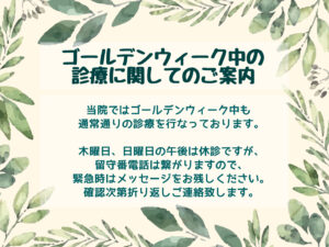 お知らせ当院ではゴールデンウィーク中も通常通りの診療を行なっております。 木曜日、日曜日の午後は休診ですが、留守番電話は繋がりますので緊急時はメッセージをお残しください。確認次第折り返しご連絡致します。