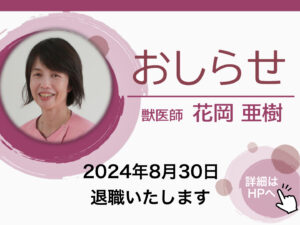 お知らせ【おしらせ】獣医師 花岡 亜樹2024年8月30日 退職いたします 私、花岡亜樹は、1998年入社以来26年にわたり当院にて動物診療に従事してまいりましたが、8月30日をもちまして退職することになりました。...